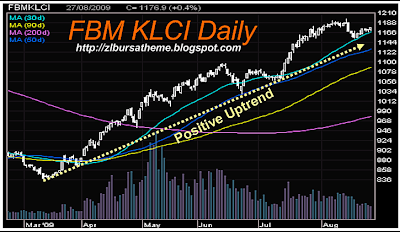 The following are the readings of some of the FBM KLCI's technical indicators:Moving Averages: The FBM KLCI continued to stay above its 10-, 20-, 30-, 50-, 100- and 200-day moving averages.